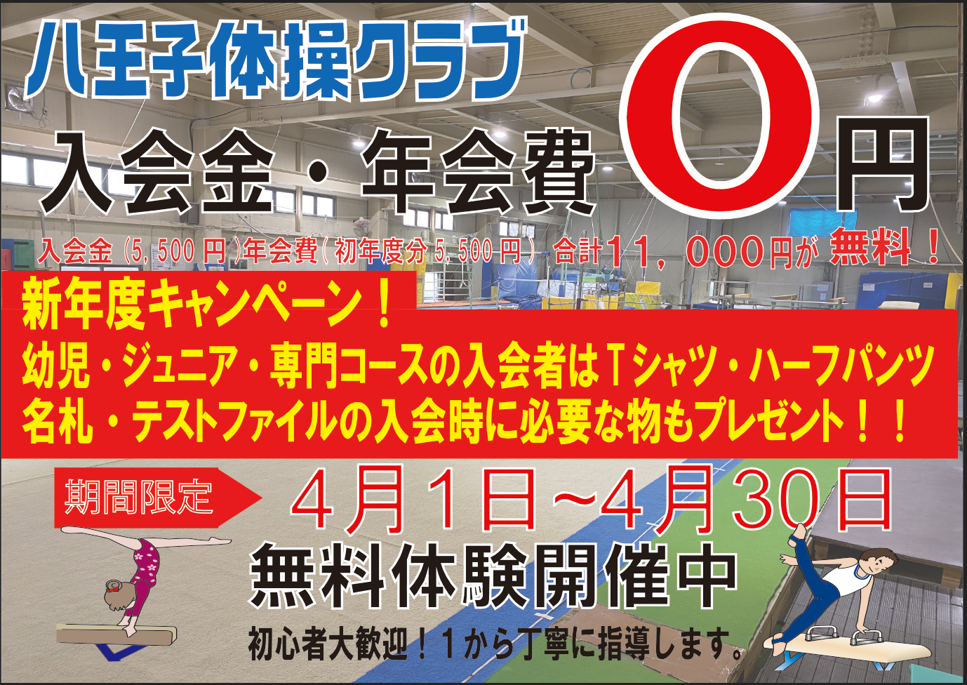 トップページ 2021.09.06 緊急のお知らせ 11月16日よりメールが受信できない状況になっておりました。現在は受信できるようになっております。11月16日~11月18日の16時の間にご連絡いただいた方は、お手数おかけし大変申し訳ありませんが、再度ご連絡をお願い致します。 お知らせ 一般開放の予約キャンセルについての変更 2024.11.222025.04.23 駐車場増設 2024.04.23 代表取締役変更についてのお知らせ 2024.01.102024.01.17 施設開放!!体操競技専用プラン! 2022.07.20 指導者募集中! 2022.07.06 もっと見る